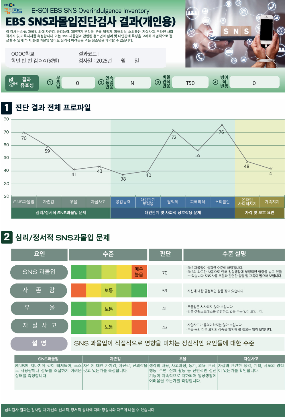 결과는 온라인심리검사완료 후 실시간결과를 화면으로 확인하실 수 있으며, 추후 구매한 승인번호로도 확인 하실 수 있습니다.